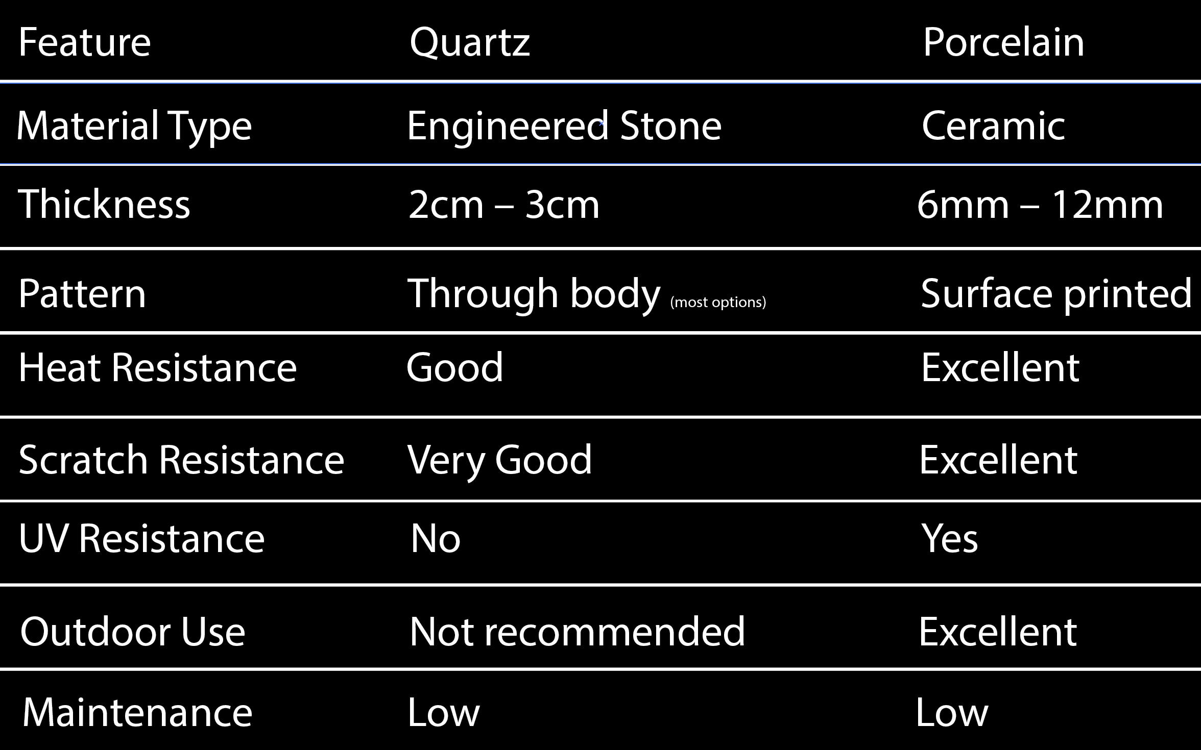 Both quartz and porcelain are non-porous materials, which means they do not require sealing like granite or marble.