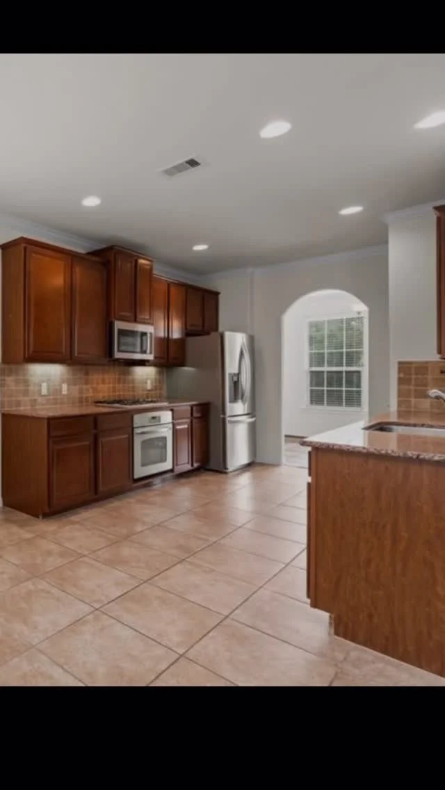 Granite countertops with Porcelain vent hood and shelves.