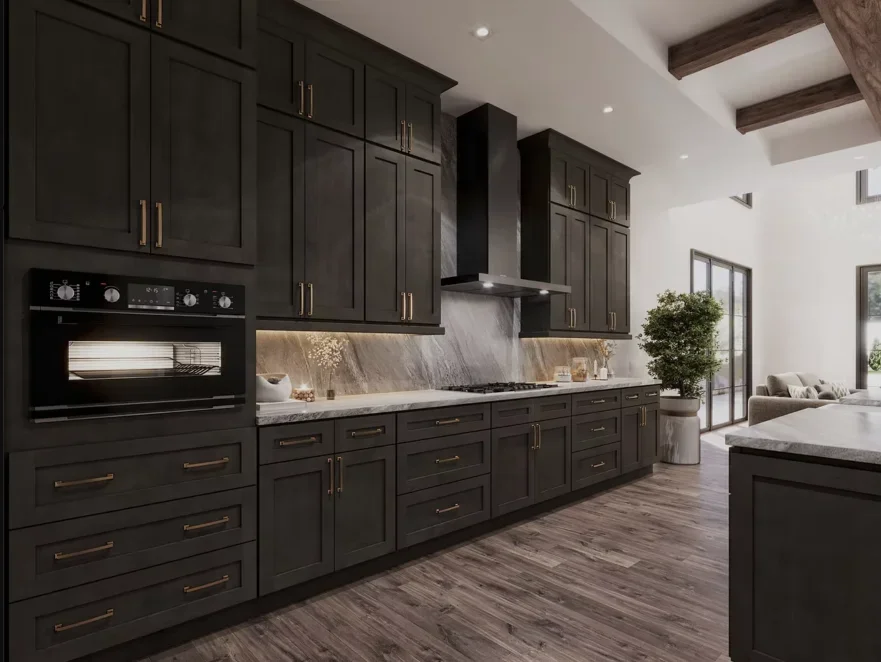 Our Smokey Grey cabinet line receives a transitional style door & drawer front with a contemporary stain grey finish. Smokey Grey perfectly compliments both traditional and contemporary spaces, plus it comes standard with soft-closing hinges & drawer-glides all wood construction.